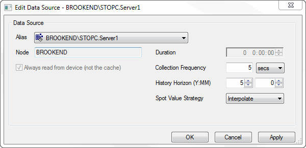 When the chosen Data Source is an HDA OPCServer, the Edit Data Source dialog will looks as follows: